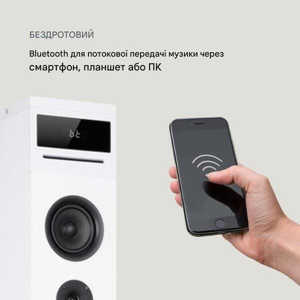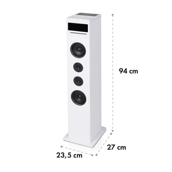 Базове оснащення компактної баштової колонки Karaboom 100 Sing включає CD-програвач і USB-порт, що дозволяє відтворювати незліченну кількість MP3. Другий порт USB також можна використовувати для заряджання всіх пристроїв з відповідним підключенням. Музику можна легко та бездротово передавати на динамік через Bluetooth за допомогою смартфона або планшета. З’єднання AUX IN доповнює набір підключень підлогового динаміка .