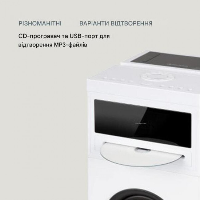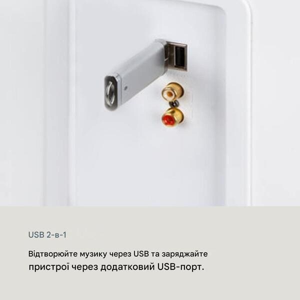 - Підключення: вхід AUX, роз'єм USB, порт зарядки USB