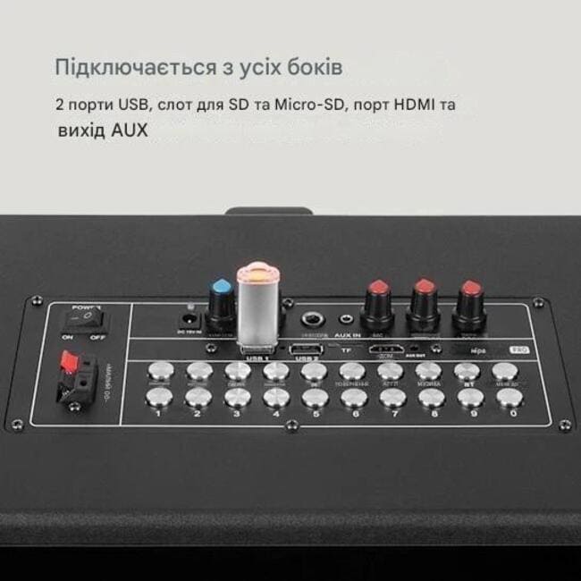 - Підключення: 2 x USB-порт, 1 x SD слот, 1 x Micro SD слот, 1 x 6,3 мм мікрофонний/гітарний вхід, 1 x HDMI порт, 1 x 3,5 мм вихід AUX, 1 x термінали для динаміків