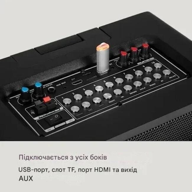 - Порти: 1 порт USB, 1 слот TF, 1 вхід мікрофона 6,3 мм, 1 порт HDMI, 1 вихід AUX 3,5 мм.