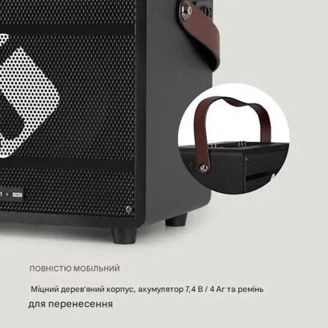 - Повністю мобільний: міцний дерев'яний корпус, акумулятор 7,4 В/4 Агод і ремінь для перенесення.
