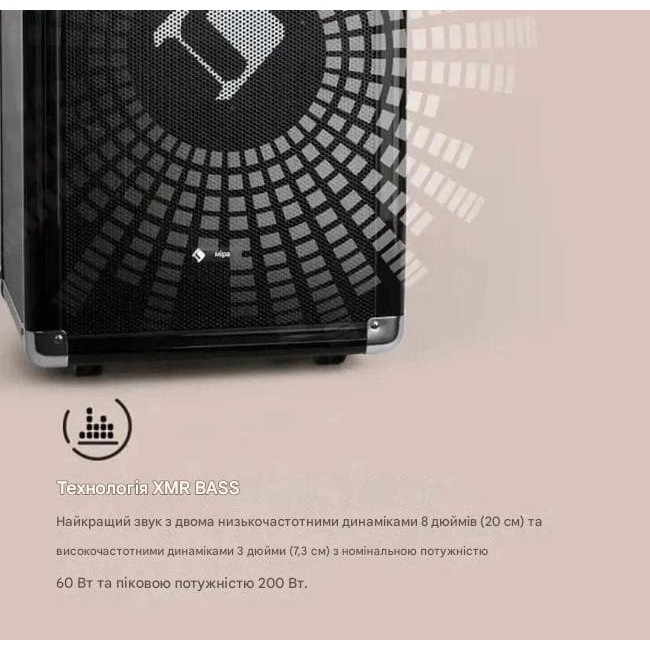 - Технологія низьких частот XMR: найкращий звук із 2 х 8" (20 см) низькочастотними динаміками та 3" (7,3 см) високочастотними динаміками з номінальною потужністю 60 Вт і піковою потужністю 200 Вт