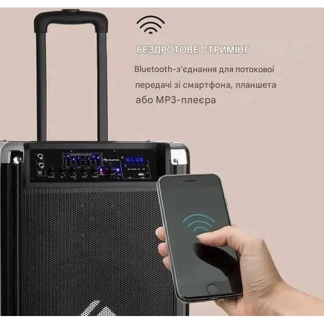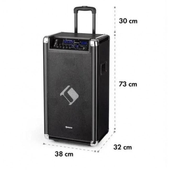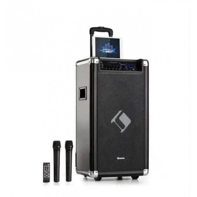 Система Moving 120 PA 2x8" низькочастотний динамік Максимум 60/200 Вт VHF-мікрофон USB SD BT AUX mobile Відкрийте для себе машину для вечірок! Система auna Moving 120 PA — ідеальне рішення для вечірок, заходів, караоке-сеансів або як домашній аудіосистеми Завдяки своїй мобільності він відразу ж готовий до використання в будь-якому місці та перетворює будь-яке місце на сяйну сцену.