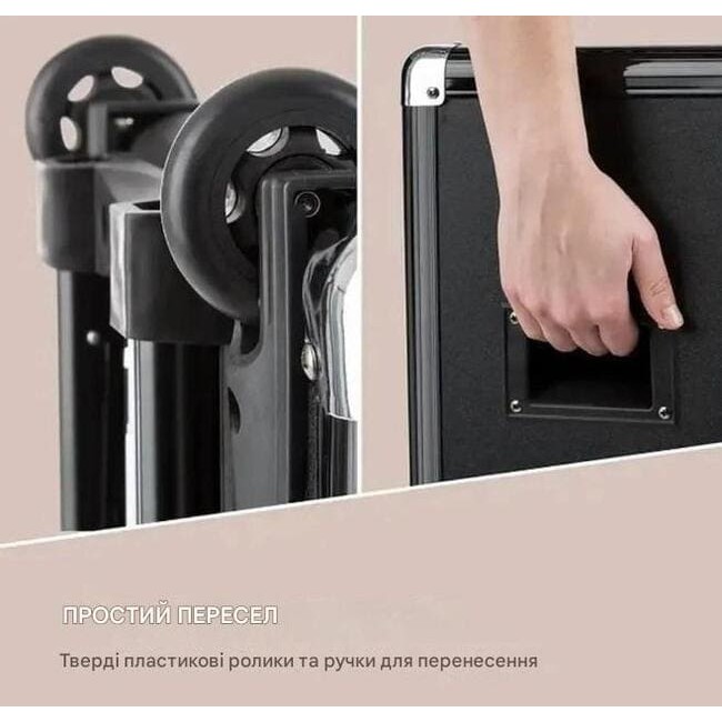 - Висока мобільність: висувна ручка візка, жорсткі пластикові підлогові ролики та ручки для перенесення