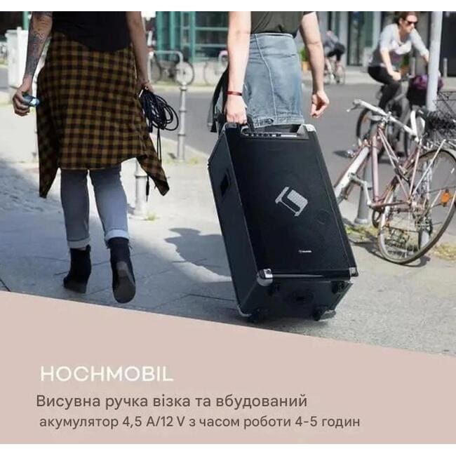 Святкуйте свою музику! З бездротовим УКВ-мікрофоном караокемашини auna Moving 120 ви можете або налаштуватися на наступну караоке-вечірку, або відразу заспівати свої власні пісні. Завдяки незалежності системи не має значення, чи перебуваєте ви вдома, у саду, у парку, на пляжі або де б ви не хотіли влаштувати вечірку. Вбудований акумулятор 4,5 А/12 В з індикатором рівня заряду працює до 5 годин повністю незалежно від мережі живлення, а також може отримувати нову енергію від автомобільного акумулятора 12 В. Висувна ручка візка, два колеса з твердого пластику та дві ручки для перенесення легко транспортують Moving 120 у будь-яке місце.