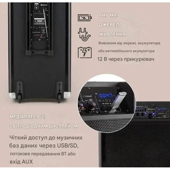- Гнучке джерело живлення: до 5 годин відтворення завдяки батареї 4,5 A / 12 В з індикатором рівня заряду та можливістю джерела живлення 12 В