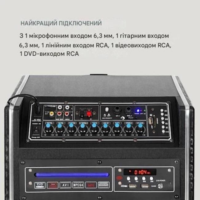 Без набридливих кабелів! Завдяки вбудованому DVD-плеєру можна завантажувати караоке-відео в різних форматах і відтворювати їх через DVD-вихід. Потужний сабвуфер розміром 2 x 10 дюймів (25,5 см) із технологією XMR Bass забезпечує навколишнє середовище потужними басами, а високочастотний динамік розміром 3 дюйми (7,5 см) забезпечує округле звукове зображення. Різноманітні варіанти підключення гарантують індивідуальне використання: з'єднання по Bluetooth зі смартфоном, планшетом або комп'ютером, USB-порт і слот SD для відтворення MP3, лінійний вхід для підключення зовнішніх аудіопристроїв HiFi, таких як CD-плеєри та стереосистеми. Входи для мікрофона та гітари збагачують потужну систему додатковими можливостями підключення. Бездротовий УВЧ-мікрофон подбає про чудове караоке, чудові співочі виступи чи проведення програм та різноманітних заходів.Портативна акустична система Pro DisGo Box DVD також добре обладнана для мобільного використання на різноманітних заходах. Міцна конструкція добре витримує навантаження, а телескопічна ручка полегшує переміщення. Потужний акумулятор 7 А 12 В забезпечує безперервну роботу від 3 до 5 годин, а індикатор стану заряду запобігає несподіваним перервам у роботі. Звичайно, DisGo Box DVD можна легко підключити до електромережі, а дистанційне керування полегшить вам керування.