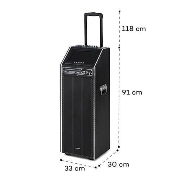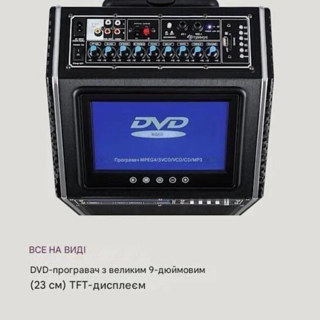 Покладіть кінець клопоту з підключенням окремих пристроїв для ідеального вокалу! За допомогою вбудованого DVD-програвача відео караоке можна читати в різних форматах і відтворювати на великому 9" (23 см) TFT дисплеї. Два потужних 10" (25,5 см) сабвуфера з технологією XMR Bassзабезпечують атмосферу гнітючими басами, які проникають під шкіру, тоді як твітер 3" (7,5 см) забезпечує добре округлене звукове зображення. Різні варіанти підключення забезпечують бажаний звук: через Bluetooth-підключення списків відтворення на смартфоні, планшеті або MP3-плеєрі , підключивши USB-накопичувачі або SD-карти до порту USB і слота SD, або через лінійний вхід від інших аудіопристроїв Hi-Fi, таких як програвачі компакт-дисків і стереосистеми. Мікрофонний вхід і вхід для електронної гітари доповнюють численні варіанти підключення .Бездротовий радіомікрофон УВЧ забезпечує гаряче караоке, збудливі вокальні виступи та захоплюючі презентації: Не зв’язаний кабелями, він сяє без перешкод навіть на великій відстані – ідеально підходить для залучення будь-якої аудиторії.Також для мобільного використання на подіях єМобільна акустична система auna Pro DisGo Box 2100 DVD добре оснащена: міцний корпус витримує значне навантаження, а подовжена ручка візка дозволяє навіть великим ді-джеям зручно тягнути систему. Потужний акумулятор 7A 12V забезпечує від 3 до 5 годин безперервної роботи. Звичайно, DisGo Box 2100 DVD також можна легко підключити до джерела живлення. Повноцінний пульт дистанційного керування також дозволяє керувати на відстані.