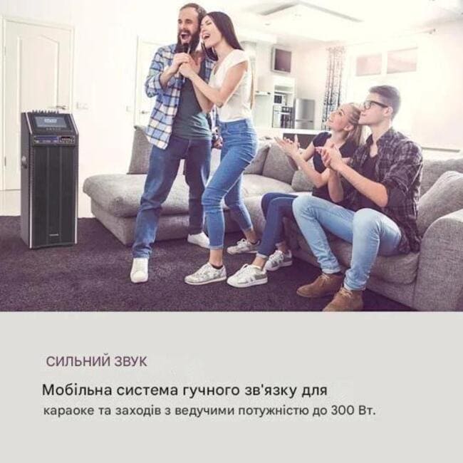 - Потужний звук: мобільна акустична система для караоке та модераторських подій з максимальною потужністю 300 Вт.