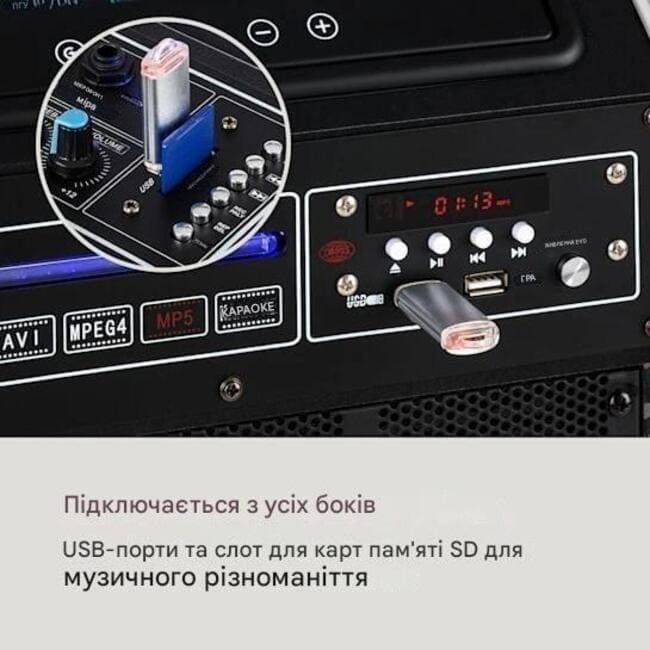 - Повністю підключається: USB-порти та слот для карти пам’яті SD для музичного різноманіття