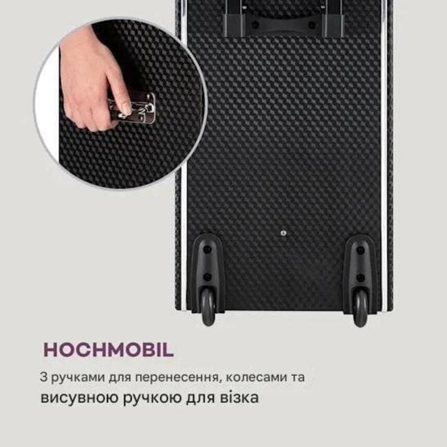 - Дуже мобільний: з ручками для перенесення, роликами для підлоги та висувною ручкою візка