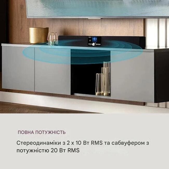 - Повна потужність: 2 x 10 Вт RMS стереодинаміки та 20 Вт RMS сабвуфер