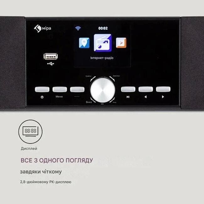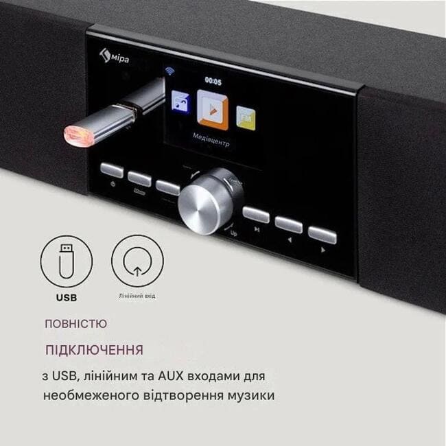 - Мультироз'єми: USB, лінійний і допоміжний вхід для необмеженого відтворення музики