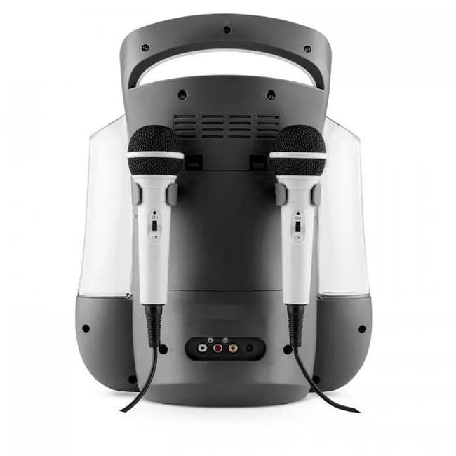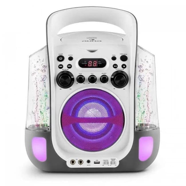 Повністю мобільна система караоке з чутливим багатобарвним світлодіодним підсвічуванням і двома блискучими фонтанами води. Програвач компакт-дисків та USB-порт з підтримкою MP3 та входом та AV виходом AUX. Секція мікрофонів із двома входами джек 6,3 мм, окремим регулятором гучності, ефектом луни та функції A.V.C.
