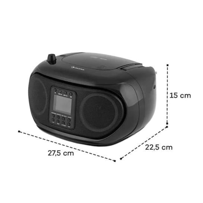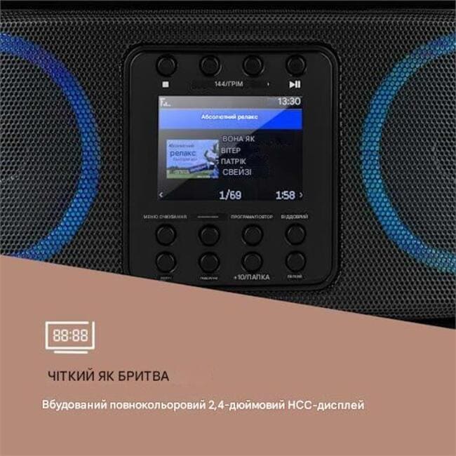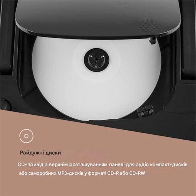 - Потужний звук: компактний CD-бумбокс із вбудованими стереодинаміками 2 x 1,5 Вт RMS