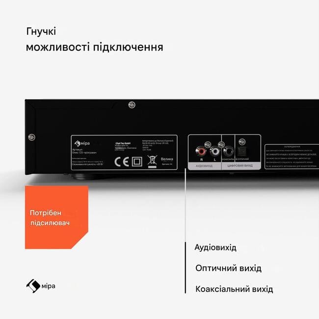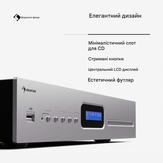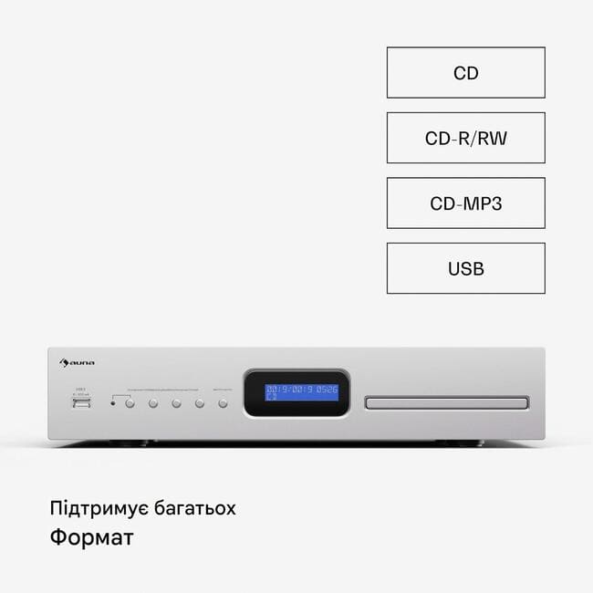 CD -програвач auna Art22 з опцією MP3. – ідеальний Hi-Fi CD-програвач для вимогливих меломанів, які цінують видатну якість звуку. Оснащений сучасним CD-приводом зі слотом та можливістю відтворення різних форматів, таких як CD, CD-R/RW та CD-MP3, цей CD-програвач пропонує універсальне використання. Завдяки USB-входу ви також можете відтворювати мультимедійні файли безпосередньо з USB-накопичувача. Auna Art22 також оснащена пультом дистанційного керування, який дозволяє керувати відтворенням, не виходячи з дивана . Цифровий дисплей завжди показує вам найактуальнішу інформацію про відтворюваний медіаконтент. Завдяки оптичним та коаксіальним виходам, Hi-Fi програвач auna Art22 пропонує гнучкі можливості підключення вашої домашньої аудіосистеми. З вихідною потужністю 130 Вт цей hi-fi CD-програвач не тільки забезпечує першокласний звук, але й надійну роботу, яка виводить ваші враження від прослуховування на новий рівень.