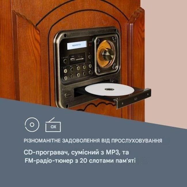 Щоб віддати належне назвою музичного автомата у ньому, звичайно ж, є програвач платівок. На додаток до трьох різних швидкостей відтворення і функції автоматичної зупинки система звукознімача вже встановлена. Так що відразу після розпакування можна починати і слухати теплий тріск старих вінілових скарбів. Бічний відсік для платівок означає, що виснажливий пошук підходящого місця для зберігання вашого улюбленого звукового компаньйона більше не потрібен.