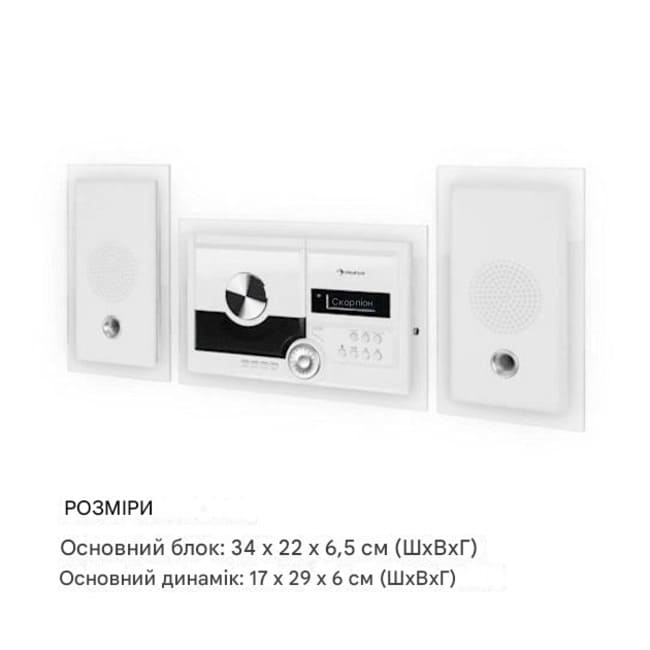 - Підключення: 1 x USB вхід, 1 x AUX вхід, 1 x вхід для антени, 2 x вихід на динамік