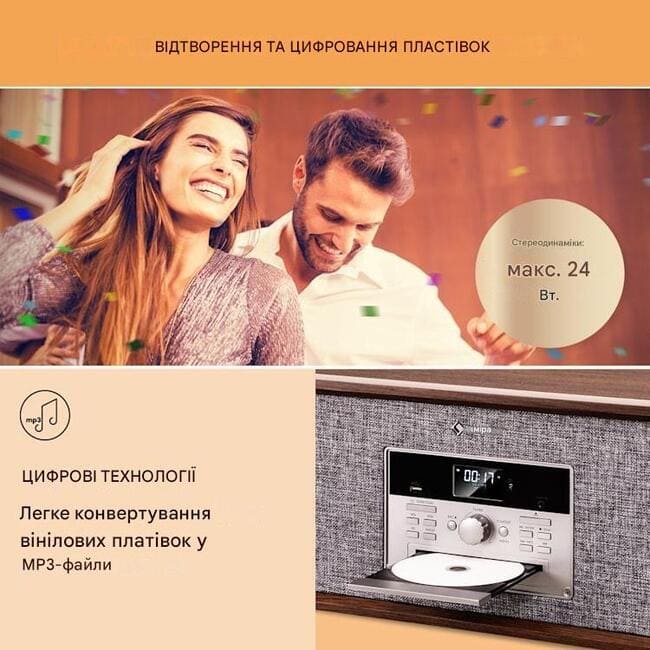 - Функція запису USB для платівок, компакт-дисків і радіо