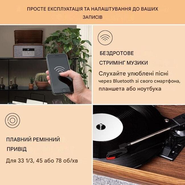 - Поворотний стіл із 33 ⅓ / 45 / 78 об/хв