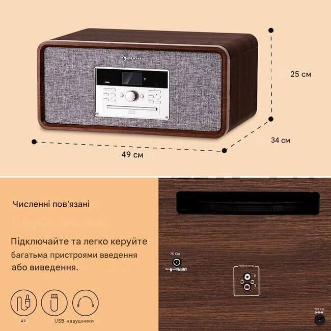 Стереосистема auna Bella Ann поєднує ностальгію з сучасними технологіями. Він пропонує численні варіанти відтворення та вражає своїм елегантним дизайном.