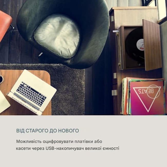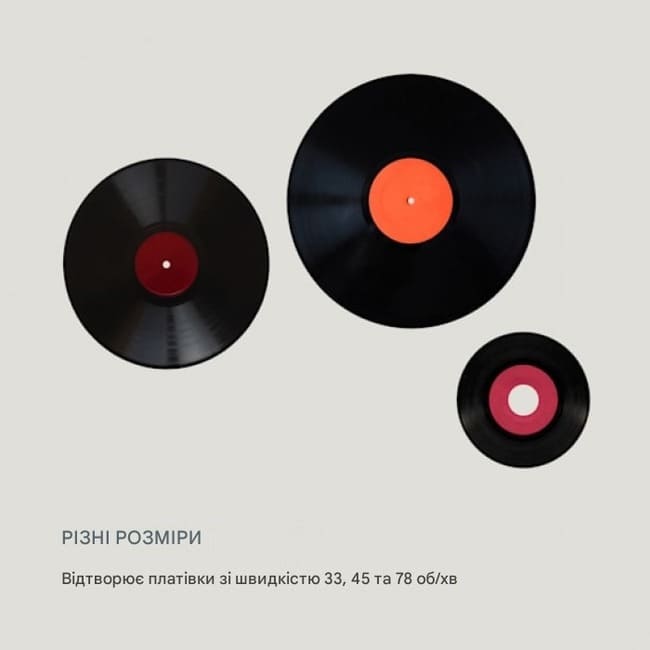- Швидкість відтворення програвача: 33 1/3, 45 і 78 обертів за хвилину