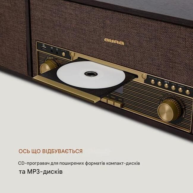 Класичні варіанти відтворення включають програвач, який може відтворювати вініл на трьох швидкостях 33 1/3, 45 і 78 об/хв. Система також має з’єднання Bluetooth для потокової передачі музики зі смартфона, планшета чи ноутбука, програвач компакт-дисків для компакт-дисків MP3 і радіотюнер DAB+/FM. Щоб також використовувати поточний носій для відтворення, програвач auna retro має USB-інтерфейс із підтримкою MP3 і функцією запису: музику, що відтворюється на програвачі або CD-програвачі, можна зберегти на USB-накопичувачі та використати пізніше Редагувати використання на ПК.