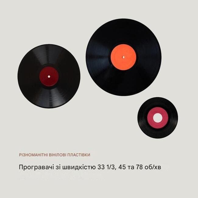 - Швидкість відтворення програвача: 33 1/3, 45 і 78 обертів за хвилину