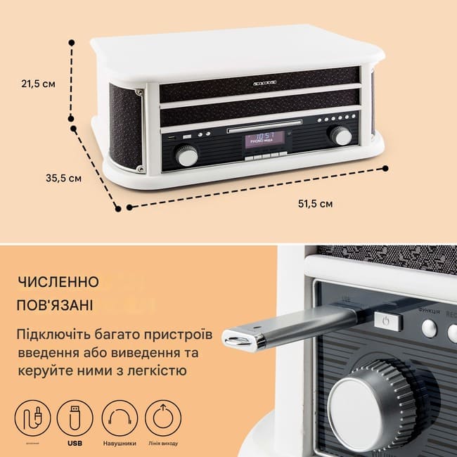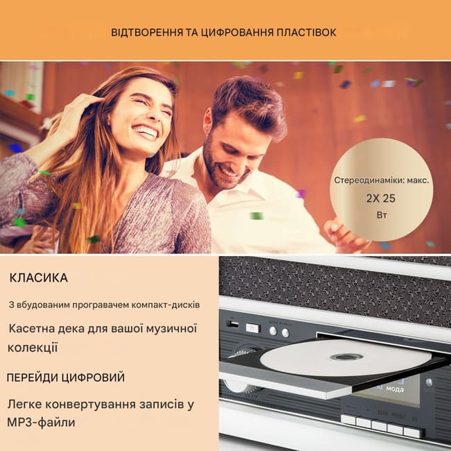 - Архівування: вміст записів, компакт- дисків або касет можна записати на USB-накопичувач і оцифрувати на ПК.
