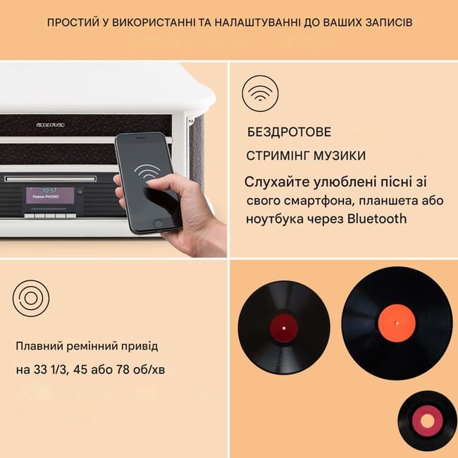 Під відкидною дерев'яною кришкою знаходиться ремінною програвач з трьома швидкостями відтворення, який пожвавить пилові колекції вінілових платівок і занурить вас в ностальгію. Касетна дека, встановлена збоку, присвячена ваших скарбів.