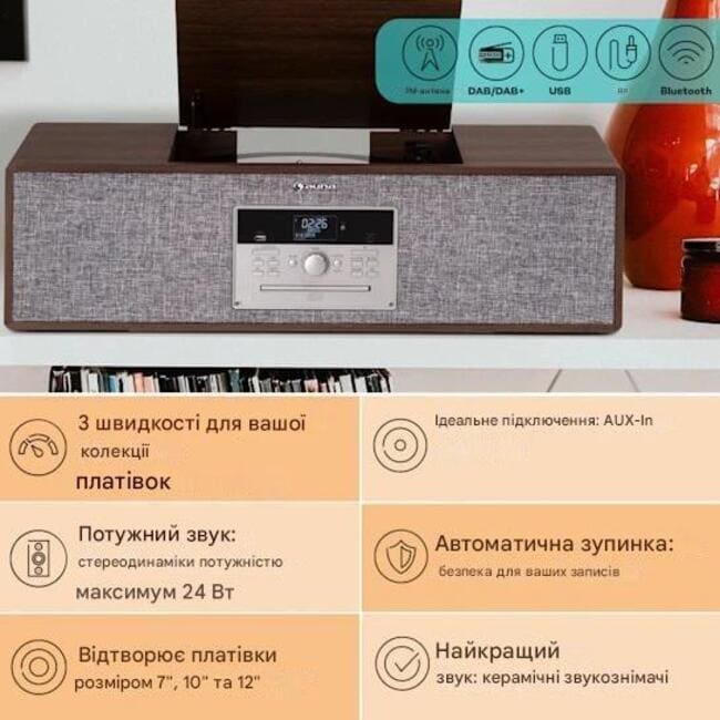 Ретро-стиль стереосистема auna Julie Ann із вертушками вражає своїм стильним виглядом у поєднанні з новітніми технологіями.