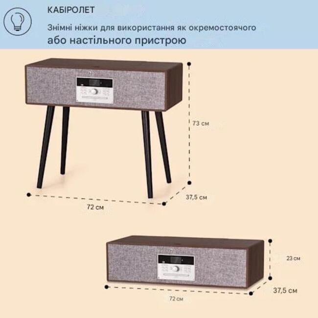 - Стильний ретро-вигляд: міцний корпус з МДФ у ностальгічному дизайні з 4 знімними ніжками