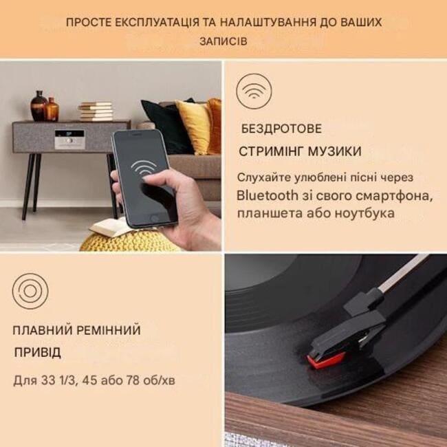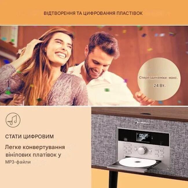 - Довгі враження від прослуховування: функція запису USB з вінілових платівок, компакт-дисків, Bluetooth або входу AUX