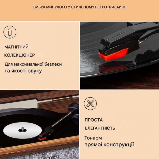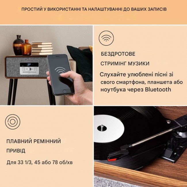 - Різні розміри: відтворює записи зі швидкістю 33 ⅓, 45 і 78 об/хв