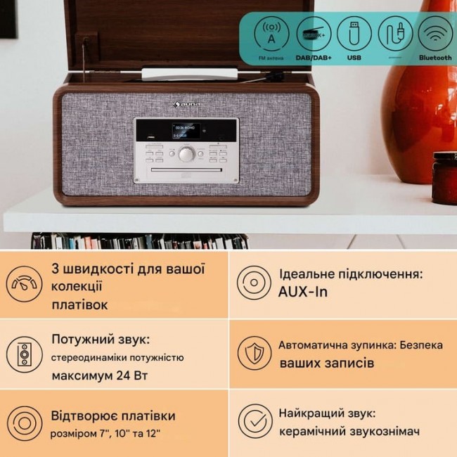 Стереодинаміки вже вбудовані в його компактний корпус, що означає, що програвач одразу готовий до відтворення. Усі три стандартні розміри платівок знаходять своє місце на вертушці й обертаються без втоми. Mary Ann також має ряд інших доступних варіантів відтворення: програвач компакт-дисків для форматів CD, CD-R, CD-RW і MP3, а також DAB+ і FM-радіо з автоматичним скануванням ваших улюблених радіостанцій у безшумній якості. . USB-порт доступний для відтворення MP3 або для запису платівок, компакт-дисків або радіо. Bluetooth-з’єднання програвача auna Mary Ann дозволяє здійснювати потокову передачу зі смартфона, планшета або комп’ютера.