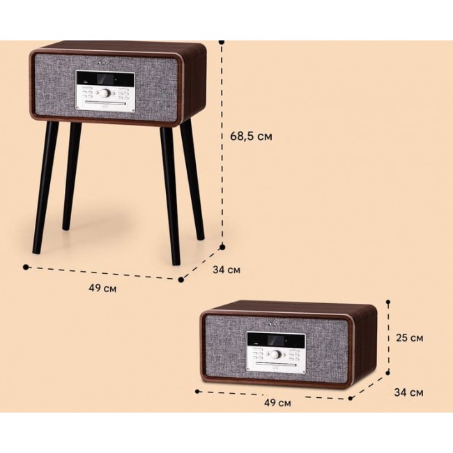 Auna Mary Ann - це сучасна техніка в елегантному ретро-стилі 50-х років. Завдяки знімним ніжкам він вражає як дизайнерський предмет меблів у стилі приставного столика або як настільний пристрій із виглядом світового приймача!