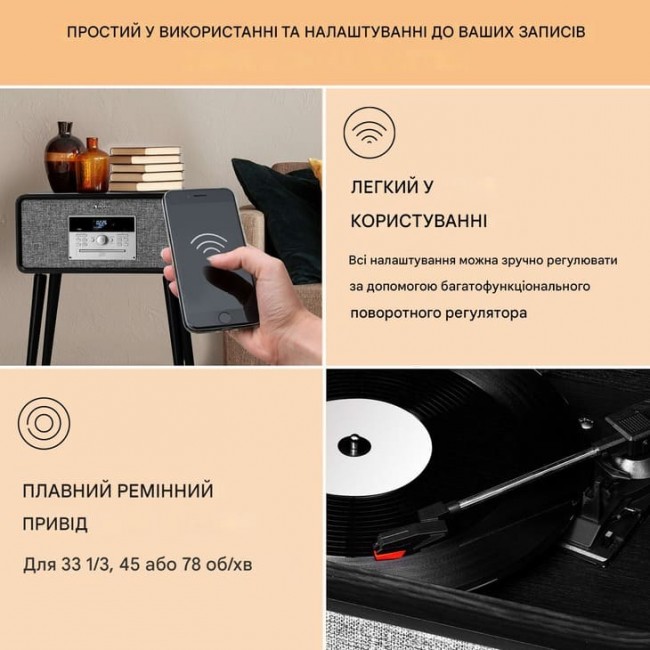 • Різні розміри: відтворює записи зі швидкістю 33 ⅓, 45 і 78 об/хв