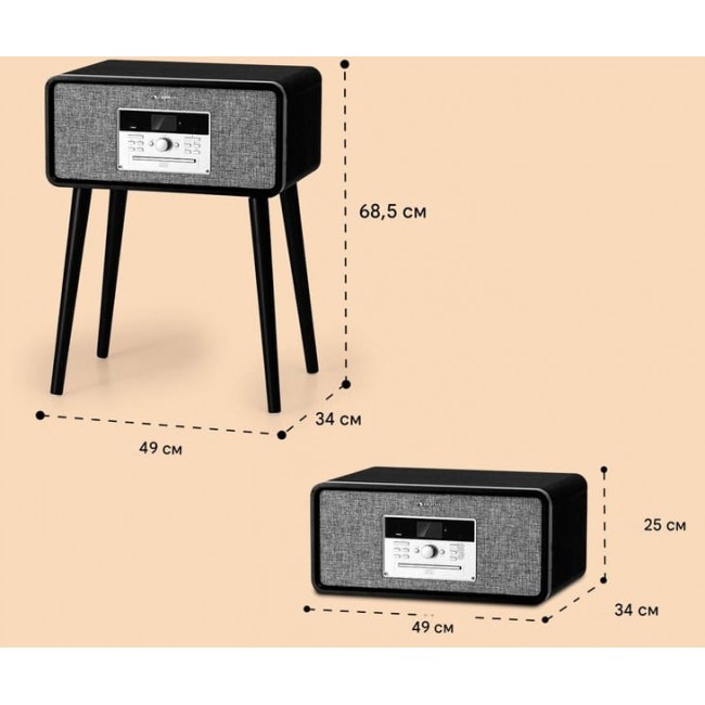 Auna Mary Ann - це сучасна техніка в елегантному ретро-стилі 50-х років. Завдяки знімним ніжкам він вражає як дизайнерський предмет меблів у стилі приставного столика або як настільний пристрій із виглядом світового приймача!