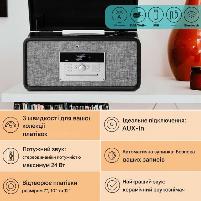 Стереодинаміки вже вбудовані в його компактний корпус, що означає, що програвач одразу готовий до відтворення. Усі три стандартні розміри платівок знаходять своє місце на вертушці й обертаються без втоми. Mary Ann також має ряд інших доступних варіантів відтворення: програвач компакт-дисків для форматів CD, CD-R, CD-RW і MP3, а також DAB+ і FM-радіо з автоматичним скануванням ваших улюблених радіостанцій у безшумній якості. . USB-порт доступний для відтворення MP3 або для запису платівок, компакт-дисків або радіо. Bluetooth-з’єднання програвача auna Mary Ann дозволяє здійснювати потокову передачу зі смартфона, планшета або комп’ютера.