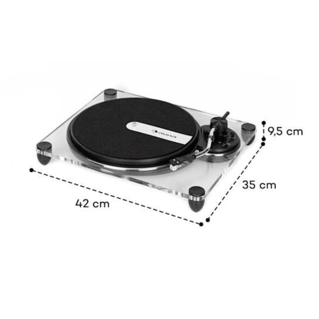 Оскільки програвач Pureness має вбудований підсилювач, він одразу готовий до відтворення та особливо цікавий меломанам, яким потрібний нескладний пристрій. Його також можна підключити до системи за допомогою кабелю RCA. Однак програвач auna Pureness приносить не тільки задоволення для вух: проста елегантність корпусу з акрилового скла радує око і є справжньою приманкою для очей у вітальні.