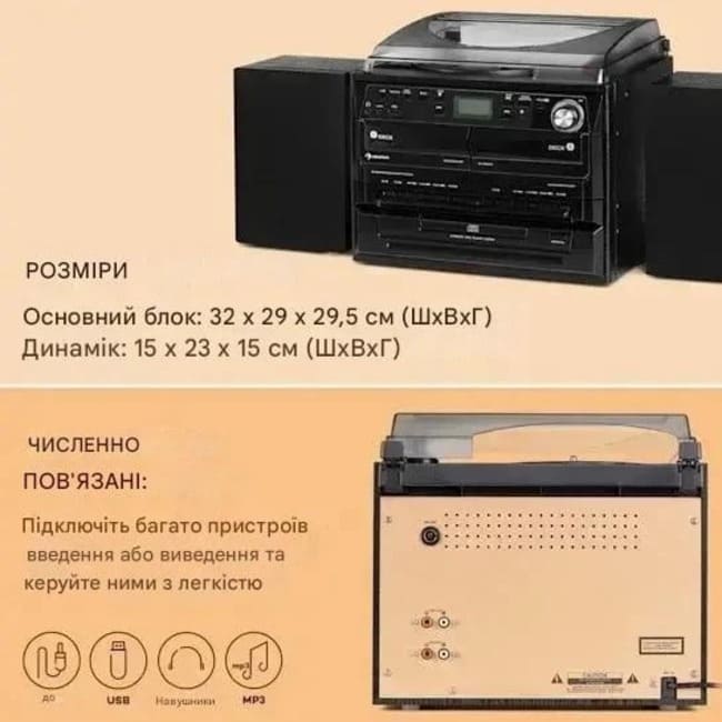 - Універсальне під'єднання: USB-порт для відтворення MP3 і запису аналогових музичних творів