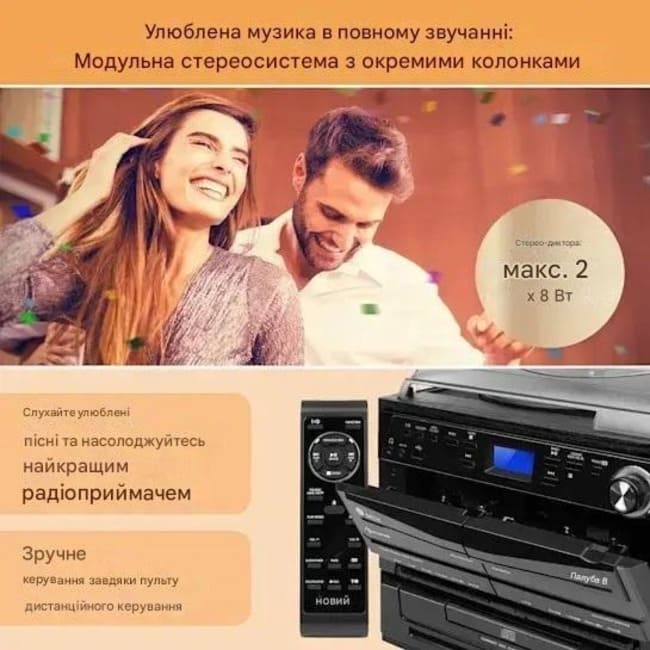 - Універсальна музична система: універсальна стереосистема з двома окремими динаміками