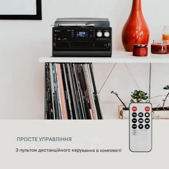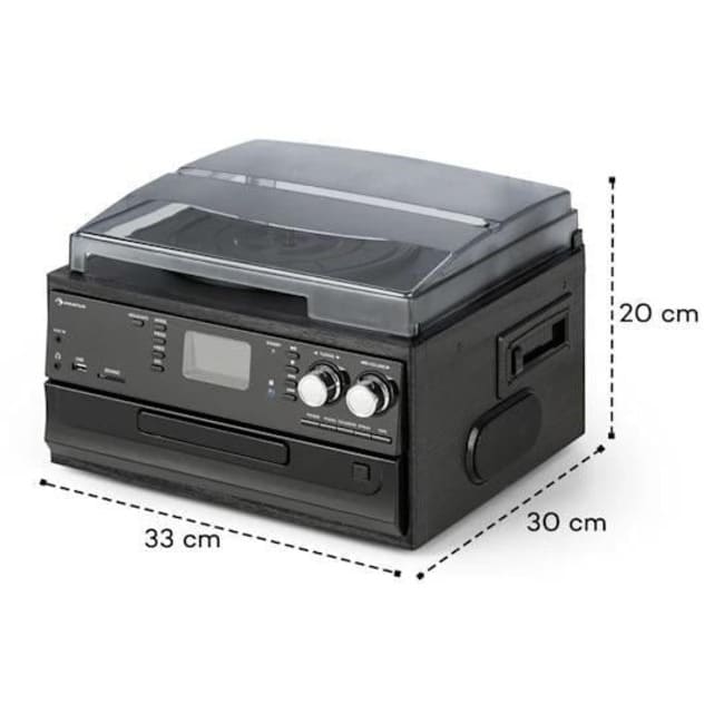 Центральним елементом ретро-стереосистеми є вертушка, прихована під кришкою, яка разом із вбудованою збоку касетною декою та MP3-сумісним програвачем компакт-дисків утворюють усі важливі музичні віхи 20-го століття. Поворотний стіл з ремінним приводом і трьома швидкостями, 33, 45 і 78 об/хв, підтримує щоденну обертання стереосистеми auna, як і касети та компакт-диски. Його навички підключення, коли мова йде про сучасне медіа-обладнання, представлені вбудованими на передній панелі з’єднаннями USB і SD, за допомогою яких звук з касет, компакт-дисків або платівок можна без особливих зусиль передавати як файл MP3 на USB або SD. Швидко та комфортно – і без допомоги комп’ютера. Пересуваючись у майбутнє, ви знайдете радіо-тюнер FM/DAB+, який на додаток до локальних сигналів отримує високоякісні цифрові канали без шумів. Однак ви відчуваєте себе повністю в сьогоденні лише завдяки функції Bluetooth, за допомогою якої аудіофайли зі смартфона, планшета або ноутбука можна бездротово та без зусиль відтворювати на ретро-стереосистемі auna Oakland DAB. Завдяки багатьом функціям і вбудованим динамікам ретро-стереосистема auna Oakland DAB виявляється надзвичайно повним, економним HiFi рішенням, серед іншого, для будинків і квартир з обмеженим простором. Вбудовані стереодинаміки системи auna micro характеризуються виразним звуковим зображенням, яке можна посилити зовнішнім hi-fi підсилювачем через лінійний вихід на задній панелі.