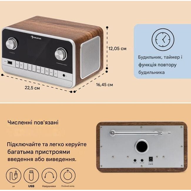Цифровий і глобальний прийом: завдяки функції будильника ви можете починати кожен день з улюбленої музики завдяки інтернет-радіо auna Connect 100 MKII .