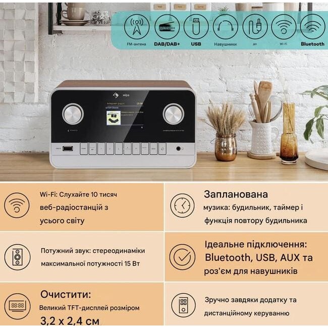 Має багато вбудованих опцій - є радіо FM, DAB, інтернет-радіо, Bluetooth, відтворює музику з флешки USB.