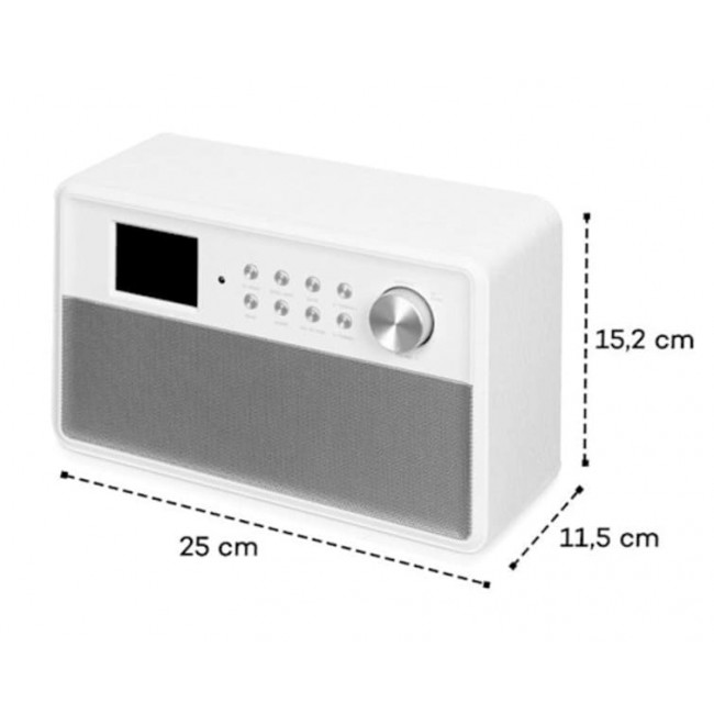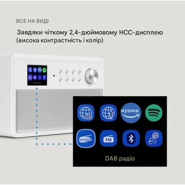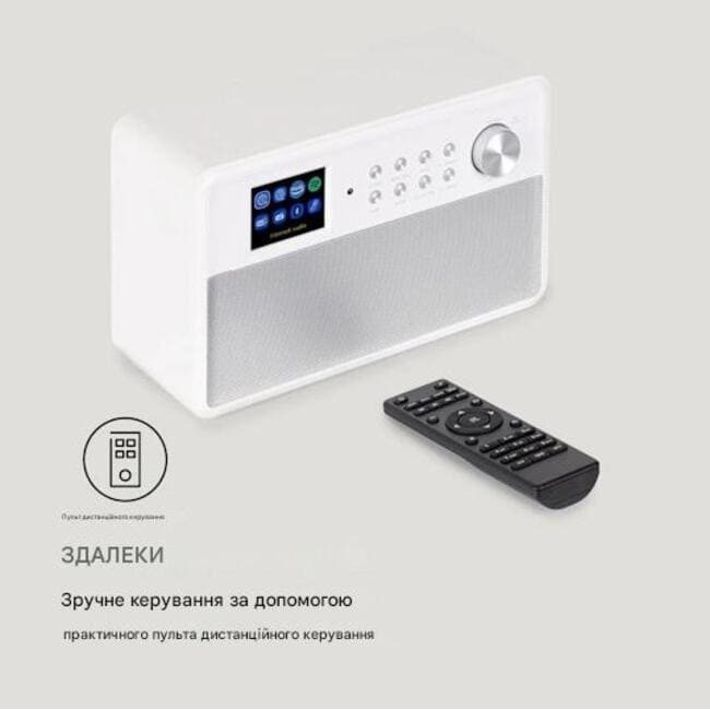 Інтернет-радіо з Bluetooth поєднує сучасні бездротові технології, стабільне мережеве з’єднання та якісний стереозвук у компактному корпусі. Пристрій підтримує потокове відтворення через Spotify Connect та Amazon Music, забезпечуючи доступ до тисяч радіостанцій і музичних сервісів з усього світу.