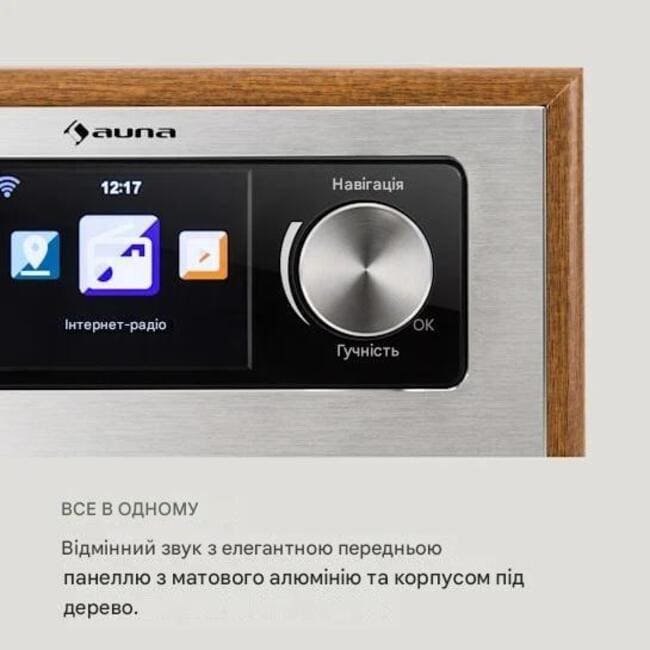 Все в одному: чудовий звук із елегантною передньою панеллю з шліфованого алюмінію та корпусом під дерево