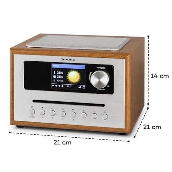 Auna Silver Star CD Cube — багатофункціональне універсальне чудо. Крім того, що він функціонує як радіо з багатьма варіантами прийому, він також пропонує можливість відтворення компакт-дисків або MP3.