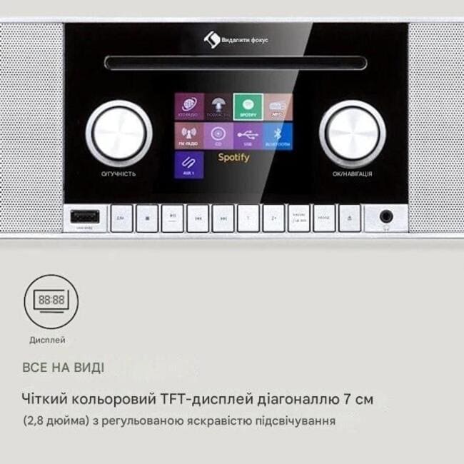 - Spotify Connect: транслюйте музику Spotify безпосередньо через Wi-Fi - доступ до понад 40 мільйонів треків