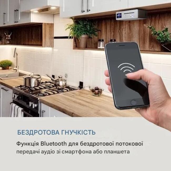 Інтернет, DAB+ і FM-радіо тюнер пропонують доступ до незліченних радіостанцій - від місцевих станцій до найвіддаленіших станцій по всьому світу. Завдяки кольоровому 2,4-дюймовому TFT-дисплею високої роздільної здатності з технологією відображення HCC ви завжди можете стежити за часом, радіостанцією, назвою та інформацією про погоду під час прослуховування. Музику можна легко транслювати та передавати зі смартфона, планшета чи ПК через інтерфейс Bluetooth можна відтворювати через спрямований вниз гучномовець Вбудований програвач компакт-дисків відтворює найпоширеніші формати та вражає своїм легким керуванням Кухонне радіо Silver Star Chef із вихідною потужністю 10 Вт RMS та 20 Вт максимум .можна керувати безпосередньо на пристрої або зручно віддалено за допомогою програми Air Music Control.Встановлений збоку порт USB і вхід AUX розширюють відтворення музики завдяки легкому підключенню зовнішніх пристроїв.Радіо під стільницею також вражає таймером сну та функцією сигналізації та, як випливає з назви, можна легко та заощаджувати місце під кухонними шафами та полицями.Фронтальна частина з полірованої нержавіючої сталі та корпус із тонким виглядом дерева надають пристрою стильного та привабливого вигляду.